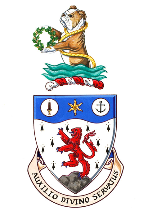 CimierBlasonUn bulldog au naturel colleté d’une corde d’or passant entre ses pattes et recourbée sur son dos, tenant entre ses pattes une guirlande de chêne fruitée au naturel, naissant de vagues du même; SymbolismeNon disponible; |