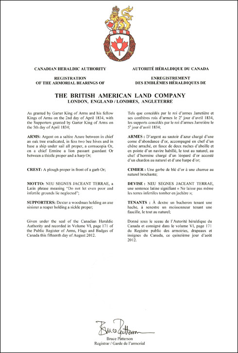 Armoiries de The British American Land CompanyBlasonD’argent au sautoir d’azur chargé d’une corne d’abondance d’or, accompagné en chef d’un chêne arraché, en fasce de deux ruches d’abeille et en pointe d’un navire habillé, le tout au naturel, au chef d’hermine chargé d’un léopard d’or accosté d’un chardon au naturel et d’une harpe d’or; SymbolismeNon disponible; |