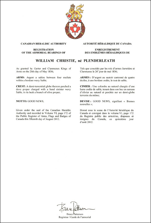 Armoiries de William Christie (né Plenderleath)BlasonD’argent au sautoir cantonné de quatre étoiles, à une bordure ondée, le tout de sable; SymbolismeNon disponible; |