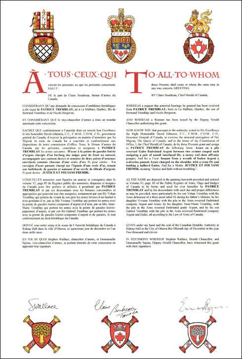 Armoiries de Patrice TremblayBlasonD’azur à la pointe de gueules lisérée d’argent chargée d’un harfang des neiges posé de front au naturel, accompagnée au canton dextre et senestre du chef de deux anneaux entrelacés sommés chacun d’une croix d’or; SymbolismeLes couleurs et métaux sont repris des armes des Tremblay d’Amérique et signifient, pour M. Tremblay, plusieurs vertus. Le bleu, couleur mariale, l’infini, la paix et la persévérance. Le rouge, le courage, la vaillance et l’audace. Le blanc, la pureté, la victoire et l’ascension spirituelle. L’or, la grandeur d’âme, la vertu et la constance. La pointe, pièce héraldique très ancienne, évoque les montagnes, celles du Perche, terre d’origine des ancêtres de M. Tremblay, et celles de Charlevoix, sa terre natale. Son sommet évoque la transcendance. Les anneaux, inspirés des armes des Tremblay d’Amérique, symbolisent l’engagement et la loyauté. Symbole du sacrifice du Christ et de pérennité, la croix illustre la foi de M. Tremblay. Le harfang des neiges, symbole aviaire du Québec, souligne qu’il est un Canadien de souche. Vénéré par les Innus comme étant le Ookpik, le protecteur des opprimés, le harfang est perçu comme étant un signe de bon présage, son regard perçant appelant à la vigilance. |