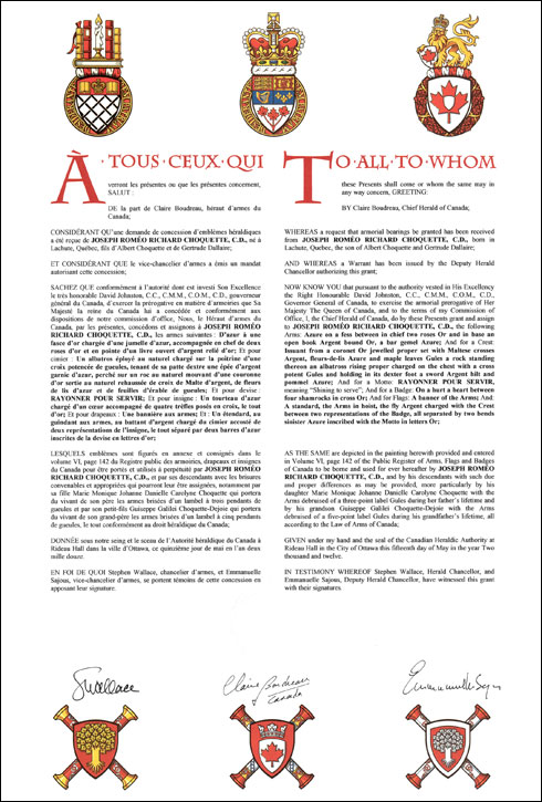 Insigne de Joseph Roméo Richard ChoquetteBlasonUn tourteau d’azur chargé d’un cœur accompagné de quatre trèfles posés en croix, le tout d’or; SymbolismeLe disque bleu symbolise la terre et les quatre trèfles, des mains ouvertes, rappelant ainsi la deuxième carrière de M. Choquette en tant que gestionnaire en ressources humaines. Le disque bleu symbolise par ailleurs ses études en géographie, tandis que les trèfles honorent sa grand-mère maternelle, qui était de descendance irlandaise. Le cœur représente l’amour et le service envers son prochain et rappelle les nombreuses années de bénévolat de M. Choquette pour le Prix du Duc d’Édimbourg et pour l’Ambulance Saint-Jean. |