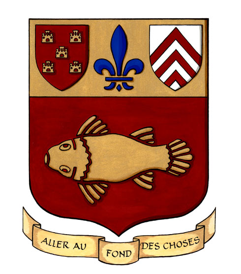 Armoiries de l'Association des ChabotBlasonDe gueules au chabot d’or posé en fasce, au chef du même chargé d’une fleur de lis d’azur accostée d’un écusson aux armes du Poitou (de gueules à cinq châteaux d’or) et d’un écusson aux armes du Perche (d’argent à trois étais de gueules); SymbolismeLe poisson, appelé chabot en héraldique, rappelle le nom de l’Association. La fleur de lis représente le pays des ancêtres communs, la France, ainsi que la terre d’accueil des Chabot en Amérique, le Québec. Les écussons qui l’encadrent sont ceux du Poitou (à gauche) et du Perche (à droite). Le Poitou est la région native de Mathurin Chabot, premier ancêtre commun arrivé en Nouvelle-France vers les années 1660 et qui s’établit sur l’Île d’Orléans en 1665. Le Perche est la région native de Marie Mésange, que Mathurin Chabot épousa en 1661 en Nouvelle-France. |