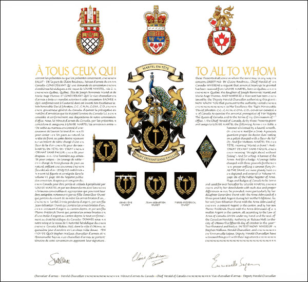 Concession d’armoiries, d’un drapeau et d’un insigne, avec brisures à Geneviève Duret, à Jean-Sébastien Duret et à Pierre-Fréderic Duret