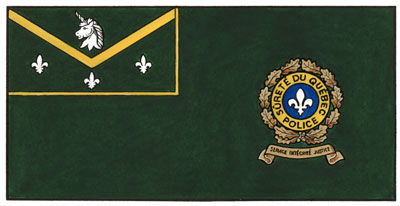 Drapeau pour l’usage de la Direction des normes professionnellesBlasonDe sinople à l’insigne de la Sûreté du Québec (tel que concédé par le Héraut d’armes du Canada le 15 mars 2005), au canton aux armes liséré d’or; SymbolismeLe symbolisme de cet emblème est compris dans un ou plusieurs éléments de ce dossier. |