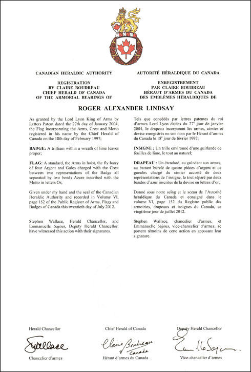 Insigne de Roger Alexander LindsayBlasonUn trille environné d’une guirlande de feuilles de lime, le tout au naturel; SymbolismeLe trille est l’emblème floral de l’Ontario, où habite M. Lindsay. Il représente aussi la Sainte Trinité. Les fleures de lime qui l’encerclent sont les fleurs emblèmes du clan écossais Lindsay. |