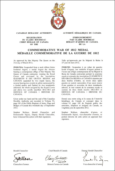 Médaille commémorative de la guerre de 1812BlasonSuspendue à un ruban de gueules bordé d’argent, une médaille d’argent portant à l’avers une effigie contemporaine de Sa Majesté la Reine du Canada contournée portant la couronne royale et entourée des inscriptions ELIZABETH II DEI GRATIA REGINA et CANADA séparées par deux feuilles d’érable, au revers deux épées passées en sautoir surmontées d’une ancre munie d’une gumène et accostées de deux tomahawks adossés, le tout sommé de la couronne royale et soutenu de deux listels inscrits 1812-1815 et DEFENCE OF CANADA • DÉFENSE DU CANADA; SymbolismeLa médaille reprend une forme similaire à celles conférées aux alliés autochtones de la Couronne suite à la Guerre de 1812. L’avers montre une effigie de Sa Majesté la Reine, indiquant que la médaille est décernée au nom du Souverain. Le revers reprend le concept de la Bannière commémorative des Forces canadiennes pour la Guerre de 1812, honorant ainsi la Marine royale et la Marine provinciale, l’Armée britannique et les milices coloniales, ainsi que leurs alliés des Premières nations qui ont défendu l’Amérique du Nord Britannique lors de la guerre de 1812. Ces trois entités de combat sont représentées respectivement par l’ancre, les épées et les tomahawks. Le ruban reprend les couleurs du drapeau national du Canada, qui étaient également présentes sur la Bannière commémorative des Forces canadiennes pour la Guerre de 1812. |