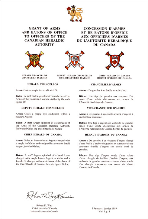 Armoiries d'office du chancelier d'armesBlasonPour le chancelier d'armes: De gueules à un érable arraché d’or; SymbolismePour le chancelier d'armes: En plus d’être un symbole national, l’érable est l’une des espèces végétales qui abondent sur les terrains de Rideau Hall, siège de l’Autorité. |