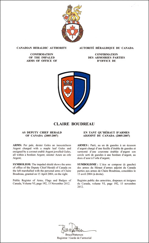 Armoiries de Claire Boudreau en tant que Héraut d'armes adjoint du CanadaBlasonParti, au un de gueules à un écusson d’argent chargé d’une feuille d’érable de gueules et surmonté d’une couronne érablée d’argent son cercle serti de gueules à une bordure d’argent, au deux d’azur à l’orle d’argent; SymbolismeL’écu se compose (à gauche) des armes du Héraut d’armes adjoint du Canada parties aux armes de Claire Boudreau, concédées le 15 avril 2004 (à droite). |