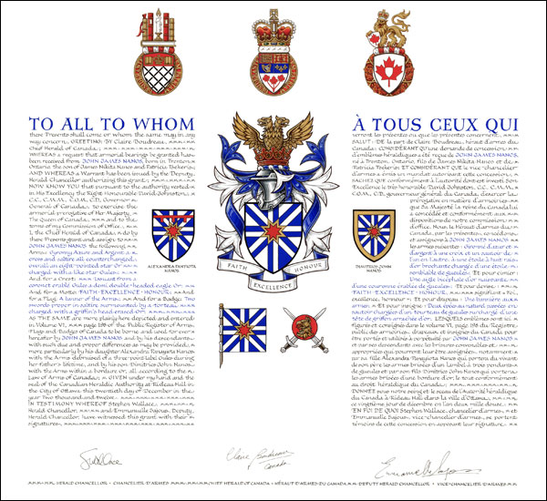 Concession d’armoiries, d’un drapeau et d’un insigne, avec brisures à Alexandra Panayiota Nanos et à Dimitrios John Nanos