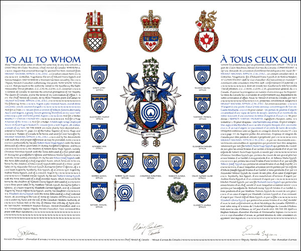 CimierBlasonUn portail de poutres d’argent entrelacé d’une vigne de lierre de sinople, soutenu d’un monticule du même mouvant d’une couronne de trilles d’argent et d’azur; SymbolismeLe lierre fait référence au nom Eppich (lierre en haut-allemand moyen). L’arche formée de poutres de béton représente la résidence conçue pour M. Eppich par l’architecte canadien de renom Arthur Erickson. Le mont vert symbolise les montagnes et les jardins verdoyants qui entourent cette résidence de West Vancouver. Les trilles poussent en abondance sur la propriété et représentent Helmut et Hildegard Eppich, leurs quatre enfants et leurs nombreux petits-enfants. |