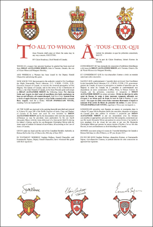 Armoiries de Brian Alexander MironBlasonDivisé en chevron de sable semé de flocons de neige à deux taureaux rampants affrontés sur argent à un hibou posé de front, le tout de l’un à l’autre; SymbolismeLe taureau est un symbole de puissance, de force et de persévérance. Pour M. Miron, il évoque aussi une figure paternelle et rappelle que l’effort et le travail acharné doivent servir à la communauté élargie. Le hibou symbolise l’apprentissage et la sagesse. Les flocons de neige représentent le Canada, pays natal de M. Miron. |