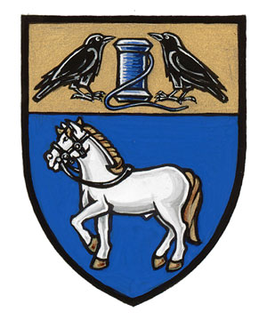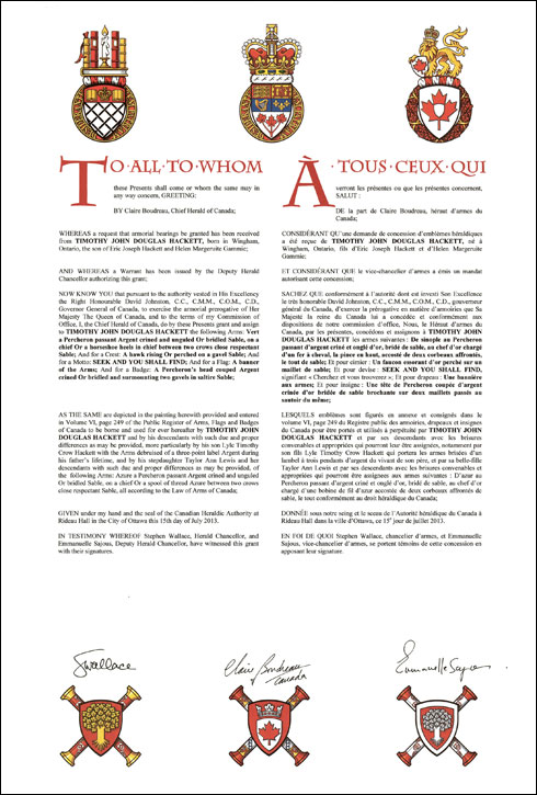 Armoiries de Timothy John Douglas HackettBlasonDe sinople au percheron passant d’argent criné et onglé d’or, bridé de sable, au chef d’or chargé d’un fer à cheval, la pince en haut, accosté de deux corbeaux affrontés, le tout de sable; SymbolismeLe vert et l’or symbolisent la terre et ses richesses et par extension le travail de M. Hackett comme éleveur de bétail. Le percheron rappelle que la famille de M. Hackett élevait cette race de cheval lorsqu’il était enfant. Cet animal de trait symbolise le travail acharné. Le corbeau (crow en anglais) évoque le nom de famille de sa conjointe, Kimberly Ann Crow. Le fer à cheval représente le travail de maréchal-ferrant de M. Hackett. |