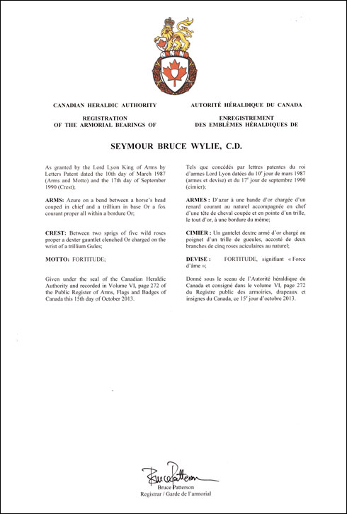 Armoiries de Seymour Bruce WylieBlasonD’azur à une bande d’or chargée d’un renard courant au naturel accompagnée en chef d’une tête de cheval coupée et en pointe d’un trille, le tout d’or, à une bordure du même; SymbolismeLe bleu et l’or ainsi que le renard sont des éléments que l’on retrouve dans les armes concédées à d’autres familles Wylie d’Écosse. Souvent qualifié d’astucieux (wily en anglais), le renard évoque le nom de famille Wylie. La bande diagonale rappelle l’écharpe portée par un sergent d’armée, un rang atteint par trois générations de la famille. La tête de cheval évoque les régiments de cavalerie, précédemment des régiments de blindés, dont M. Wylie a fait partie, ainsi que l’emblème du Hazwill Riding School and Pony Club fondé par ses parents, Hazel et William Wylie. Le trille indique que M. Wylie a servi dans chacun des trois services de l’armée – la marine, l’armée et la force aérienne – durant ses affectations en Ontario. La bordure d’or signifie que M. Wylie est le deuxième fils de son père William Franklin Wylie. |
