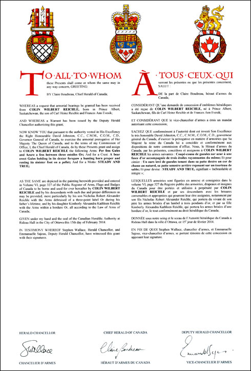 CimierBlasonUn ours levé de gueules tenant dans sa patte dextre un cor de chasse au naturel, sa patte senestre arrière reposant sur un tourteau de sable; SymbolismeL’ours symbolise l’amour de M. Reichle pour la chasse. Le cor de chasse s’inspire de celui qui orne l’insigne du North Saskatchewan Regiment, dans lequel il a servi. Le boulet de canon rappelle le service militaire de M. Reichle. |