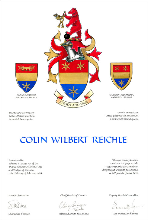 Concession d’armoiries avec brisures à Nicholas Robert Alexander Reichle et à Kimberly Alexandra Kathleen Reichle