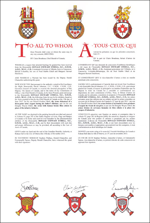 Concession d’armoiries brisées pour l'usage de Darrell Gordon Ethell et de Douglas Wayne Ethell