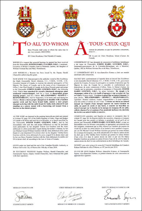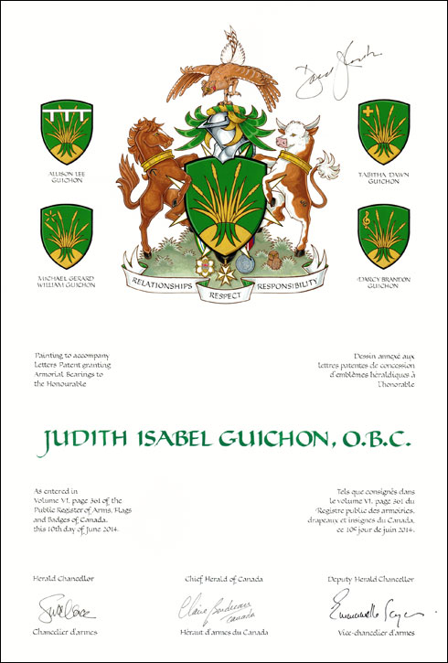 Concession d’armoiries et de supports, avec brisures à Allison Lee Guichon, à Michael Gerard William Guichon, à Tabitha Dawn Guichon et à Darcy Brandon Guichon