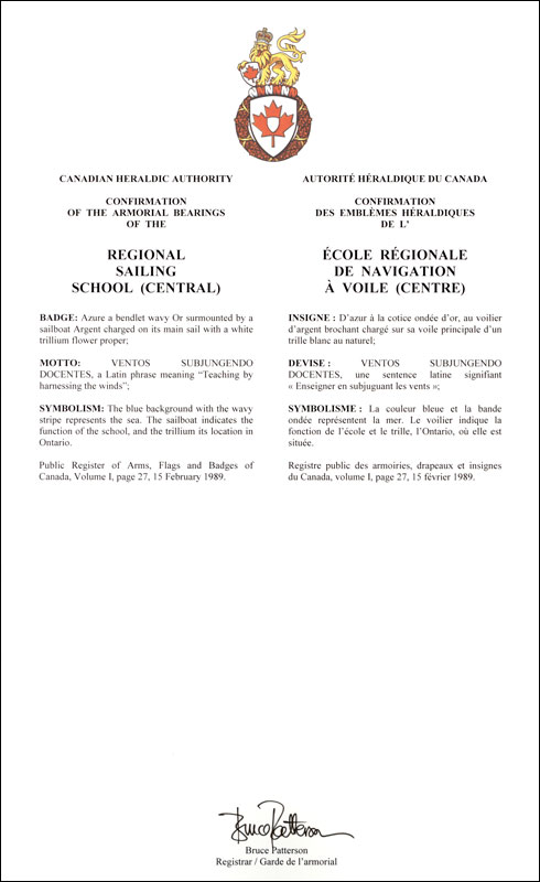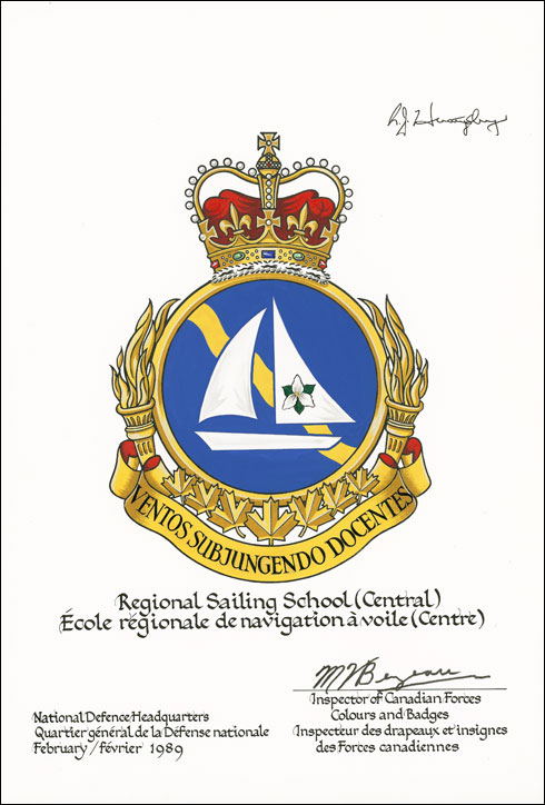 Insigne de l'École régionale de navigation à voile (Centre)BlasonD’azur à la cotice ondée d’or, au voilier d’argent brochant chargé sur sa voile principale d’un trille blanc au naturel; SymbolismeLa couleur bleue et la bande ondée représentent la mer. Le voilier indique la fonction de l’école et le trille, l’Ontario, où elle est située. |