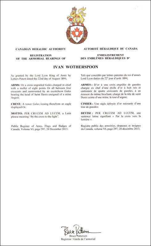 Informations additionnellesCréateur(s)Non disponible Artiste-peintreSans objet CalligrapheSans objet Type de récipiendaireIndividuel Autres renseignementsLes emblèmes du récipiendaire ont été précédemment consignés dans les archives de la Cour du Roi d’armes Lord Lyon, Édimbourg, Écosse, le 22 août 1894. |