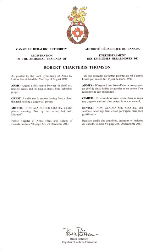Informations additionnellesCréateur(s)Non disponible. Artiste-peintreSans objet CalligrapheSans objet Type de récipiendaireIndividuel Autres renseignementsLes emblèmes du récipiendaire ont été précédemment consignés dans les archives de la Cour du Roi d’armes Lord Lyon, Édimbourg, Écosse, le 22 août 1894. |