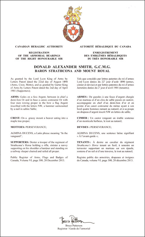 Armoiries de Donald Alexander SmithBlasonDe gueules à une fasce d’argent chargée d’un marteau et d’un clou de sable passés en sautoir, accompagnée en chef d’un demi-lion d’or et en pointe d’un canot contourné du même ayant à son bord quatre hommes ramant au naturel, et à sa poupe un drapeau d’argent inscrit NW en lettres de sable; SymbolismeNon disponible. |