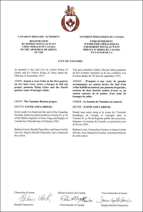 Armoiries de la City of NanaimoBlasonD'argent à une croix de gueules accompagnée au canton dextre du chef d'un voilier habillé au naturel, aux pennons de gueules, soutenu de deux burèles ondées d'azur et, au canton senestre de la pointe, d'un semé de losanges de sable; SymbolismeNon disponible. |