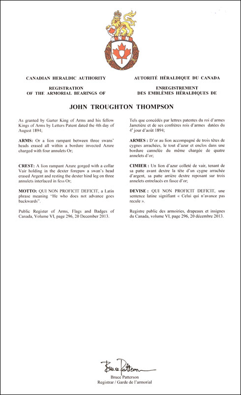 Armoiries de John Troughton ThompsonBlasonD’or au lion accompagné de trois têtes de cygnes arrachées, le tout d’azur et enclos dans une bordure cannelée du même chargée de quatre annelets d’or; SymbolismeNon disponible. |