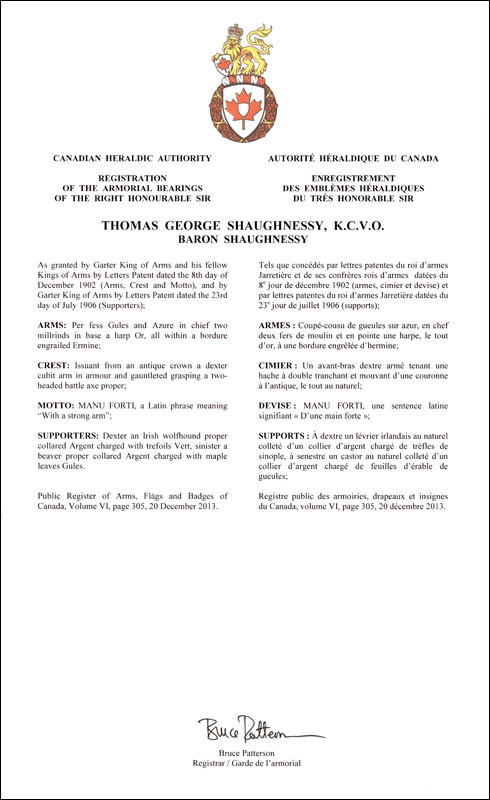Informations additionnellesCréateur(s)Non disponible. Artiste-peintreArtist of the College of Arms, London / Artiste du Collège d’armes, Londres CalligrapheSans objet Type de récipiendaireIndividuel Autres renseignementsLes emblèmes du récipiendaire ont été précédemment consignés dans les archives du Collège d’armes, Londres, Angleterre, le 8 décembre 1902 (armes, cimier et devise) et le 23 juillet 1906 (supports). |