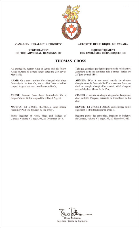 Armoiries de Thomas CrossBlasonD’or à une croix ancrée de sinople chargée de trois fleurs de lis d’or posées en fasce, au chef de sinople chargé d’un sautoir alésé d’argent accosté de deux fleurs de lis d’or; SymbolismeNon disponible. |