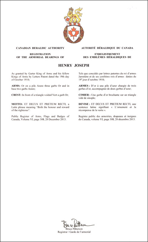 L'utilisation du contenu du Registre public est réservée à des fins de recherche uniquement. Les emblèmes héraldiques du Registre ne peuvent être reproduits sous aucune forme ou par quelque procédé que ce soit sans l'autorisation écrite de l'Autorité héraldique du Canada et/ou du récipiendaire.