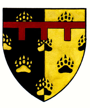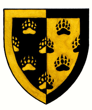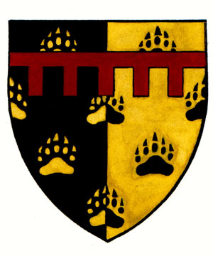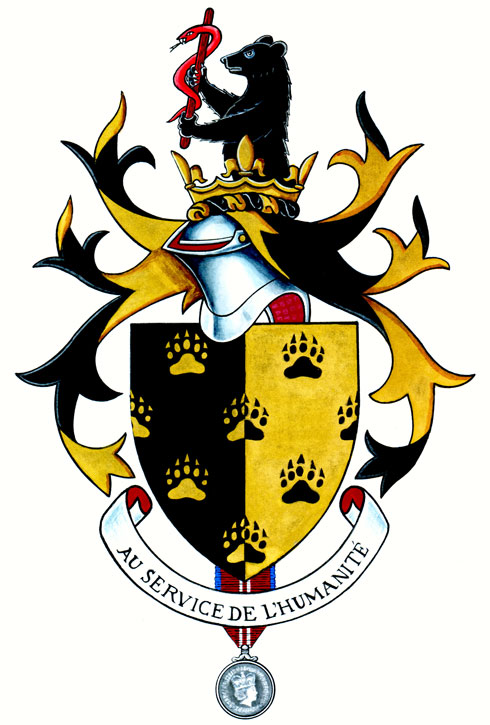 Armoiries d'Aylmer BakerBlasonParti de sable et d’or semé d’empreintes de pattes d’ours de l’un à l’autre et de l’un en l’autre; SymbolismeLe noir et le jaune sont repris des armoiries du Saint-Empire romain germanique, terre ancestrale de Jean-Baptiste Ébacher, premier ancêtre du Dr Baker établi au Canada. Les empreintes d’ours, un animal auquel le Dr Baker s’identifie, représentent sa profession de chiropracticien, où le sens du toucher est primordial. Les mains sont également un symbole d’entraide et de générosité, rappelant ainsi les nombreuses années de service du Dr Baker auprès de divers organismes communautaires. Le jeu des couleurs évoque une radiographie, une autre allusion à sa profession. |