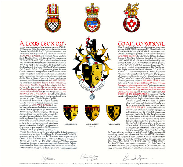 Concession d’armoiries, avec brisures à Manon Baker, à Marie-Andrée Cantin et à Fanny Cantin