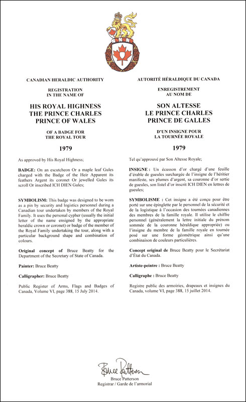 Insigne du prince Charles, prince de GallesBlasonUn écusson d’or chargé d’une feuille d’érable de gueules surchargée de l’insigne de l’héritier manifeste, ses plumes d’argent, sa couronne d’or sertie de gueules, son listel d’or inscrit ICH DIEN en lettres de gueules; SymbolismeCet insigne a été conçu pour être porté sur une épinglette par le personnel de la sécurité et de la logistique à l’occasion des tournées canadiennes des membres de la famille royale. Il utilise le chiffre personnel (généralement la lettre initiale du prénom sommée de la couronne héraldique appropriée) ou l’insigne du membre de la famille royale en tournée posé sur une forme géométrique ainsi qu’une combinaison de couleurs particulières. |