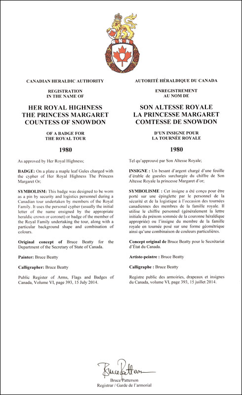 Insigne de la princesse Margaret, comtesse de SnowdonBlasonUn besant d’argent chargé d’une feuille d’érable de gueules surchargée du chiffre de Son Altesse Royale la princesse Margaret d’or; SymbolismeCet insigne a été conçu pour être porté sur une épinglette par le personnel de la sécurité et de la logistique à l’occasion des tournées canadiennes des membres de la famille royale. Il utilise le chiffre personnel (généralement la lettre initiale du prénom sommée de la couronne héraldique appropriée) ou l’insigne du membre de la famille royale en tournée posé sur une forme géométrique ainsi qu’une combinaison de couleurs particulières. |