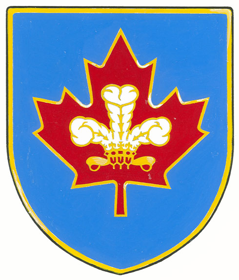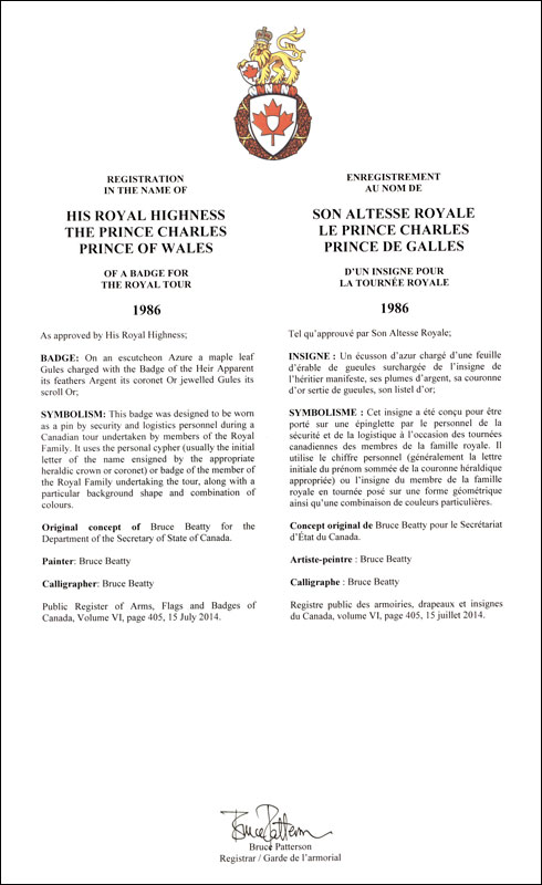Insigne du prince Charles, prince de GallesBlasonUn écusson d’azur chargé d’une feuille d’érable de gueules surchargée de l’insigne de l’héritier manifeste, ses plumes d’argent, sa couronne d’or sertie de gueules, son listel d’or; SymbolismeCet insigne a été conçu pour être porté sur une épinglette par le personnel de la sécurité et de la logistique à l’occasion des tournées canadiennes des membres de la famille royale. Il utilise le chiffre personnel (généralement la lettre initiale du prénom sommée de la couronne héraldique appropriée) ou l’insigne du membre de la famille royale en tournée posé sur une forme géométrique ainsi qu’une combinaison de couleurs particulières. |