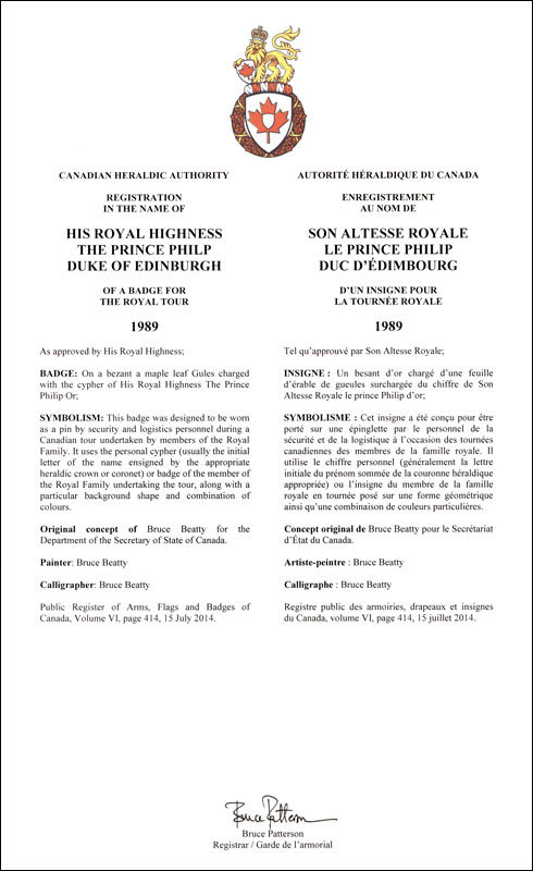 Insigne du prince Philip, duc d’ÉdimbourgBlasonUn besant d’or chargé d’une feuille d’érable de gueules surchargée du chiffre de Son Altesse Royale le prince Philip d’or; SymbolismeCet insigne a été conçu pour être porté sur une épinglette par le personnel de la sécurité et de la logistique à l’occasion des tournées canadiennes des membres de la famille royale. Il utilise le chiffre personnel (généralement la lettre initiale du prénom sommée de la couronne héraldique appropriée) ou l’insigne du membre de la famille royale en tournée posé sur une forme géométrique ainsi qu’une combinaison de couleurs particulières. |