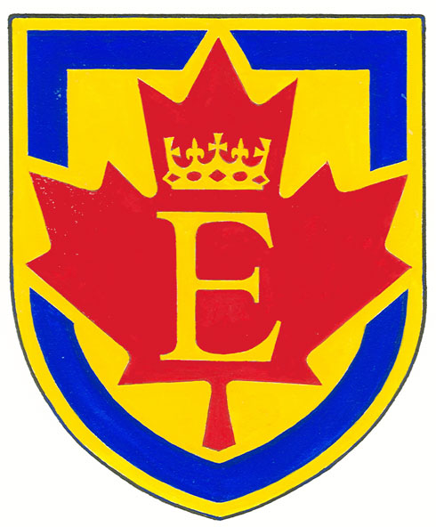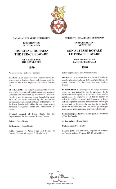 Insigne du prince EdwardBlasonUn écusson d’or à la feuille d’érable de gueules chargée du chiffre de Son Altesse Royale le prince Edward d’or brochante sur une bordure d’azur; SymbolismeCet insigne a été conçu pour être porté sur une épinglette par le personnel de la sécurité et de la logistique à l’occasion des tournées canadiennes des membres de la famille royale. Il utilise le chiffre personnel (généralement la lettre initiale du prénom sommée de la couronne héraldique appropriée) ou l’insigne du membre de la famille royale en tournée posé sur une forme géométrique ainsi qu’une combinaison de couleurs particulières. |