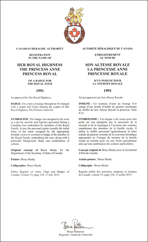 Insigne de la princesse Anne, princesse royaleBlasonUn tourteau d’azur au losange d’or chargé d’une feuille d’érable de gueules surchargée du chiffre de Son Altesse Royale la princesse Anne d’or; SymbolismeCet insigne a été conçu pour être porté sur une épinglette par le personnel de la sécurité et de la logistique à l’occasion des tournées canadiennes des membres de la famille royale. Il utilise le chiffre personnel (généralement la lettre initiale du prénom sommée de la couronne héraldique appropriée) ou l’insigne du membre de la famille royale en tournée posé sur une forme géométrique ainsi qu’une combinaison de couleurs particulières. |