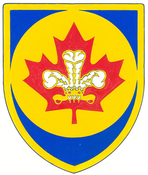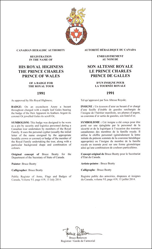 Insigne du prince Charles, prince de GallesBlasonUn écusson d’azur au besant d’or chargé d’une feuille d’érable de gueules surchargée de l’insigne de l’héritier manifeste, ses plumes d’argent, sa couronne d’or sertie de gueules, son listel d’or; SymbolismeCet insigne a été conçu pour être porté sur une épinglette par le personnel de la sécurité et de la logistique à l’occasion des tournées canadiennes des membres de la famille royale. Il utilise le chiffre personnel (généralement la lettre initiale du prénom sommée de la couronne héraldique appropriée) ou l’insigne du membre de la famille royale en tournée posé sur une forme géométrique ainsi qu’une combinaison de couleurs particulières. |