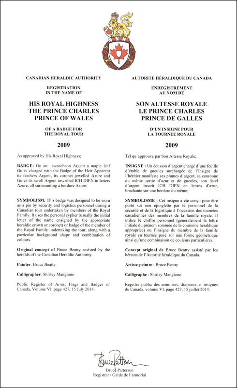 Informations additionnellesCréateur(s)Concept original de Bruce Beatty assisté par les hérauts de l’Autorité héraldique du Canada. Artiste-peintreBruce Beatty CalligrapheShirley Mangione Type de récipiendaireFamille royale |