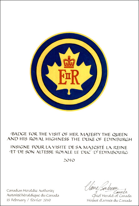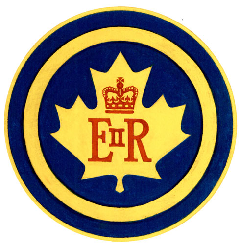 Insigne de la reine Elizabeth IIBlasonUn tourteau d’azur chargé d’une feuille d’érable d’or surchargée du chiffre de Sa Majesté la reine Elizabeth II de gueules enclose dans un orle d’or; SymbolismeCet insigne a été conçu pour être porté sur une épinglette par le personnel de la sécurité et de la logistique à l’occasion des tournées canadiennes des membres de la famille royale. Il utilise le chiffre personnel (généralement la lettre initiale du prénom sommée de la couronne héraldique appropriée) ou l’insigne du membre de la famille royale en tournée posé sur une forme géométrique ainsi qu’une combinaison de couleurs particulières. |