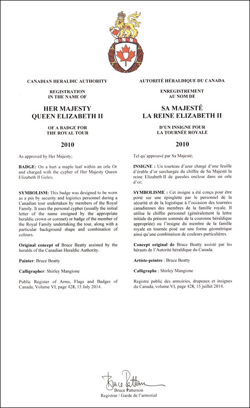 Informations additionnellesCréateur(s)Concept original de Bruce Beatty assisté par les hérauts de l’Autorité héraldique du Canada. Artiste-peintreBruce Beatty CalligrapheShirley Mangione Type de récipiendaireFamille royale |