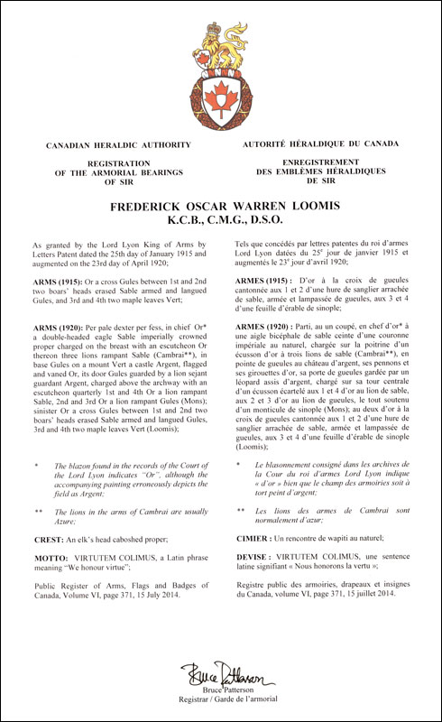 Armoiries de Frederick Oscar Warren Loomis (1915)BlasonD’or à la croix de gueules cantonnée aux 1 et 2 d’une hure de sanglier arrachée de sable, armée et lampassée de gueules, aux 3 et 4 d’une feuille d’érable de sinople; SymbolismeNon disponible. |