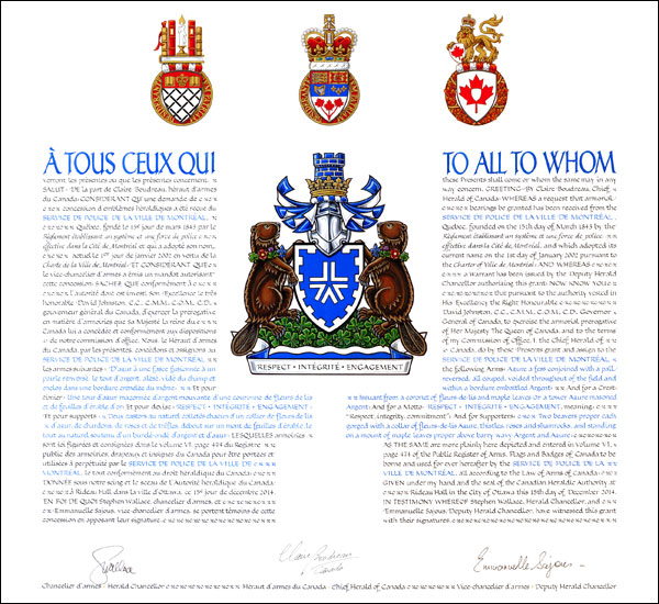 SupportsBlasonDeux castors au naturel colletés chacun d’un collier de fleurs de lis d’azur, de chardons, de roses et de trèfles, debout sur un mont de feuilles d’érable, le tout au naturel soutenu d’un burelé-ondé d’argent et d’azur; SymbolismeLes castors représentent le travail et la détermination. Cet animal, tout comme les fleurs qui composent son collier, est repris des armoiries de la Ville de Montréal et rappelle le lien entre le service de police et la ville. |