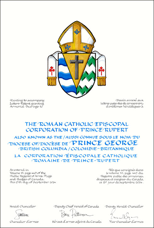Armoiries de La corporation épiscopale catholique romaine de Prince-Rupert (aussi connue sous le nom de Diocèse de Prince George)BlasonD’argent à trois burèles ondées d’azur mi-parties à trois burèles denchées de sinople, à la pile d’or chargée d’une croix latine de sable; SymbolismeLe fond de l’écu fait allusion à la côte de l’océan Pacifique, ainsi qu’au paysage montagneux et boisé du Nord de la Colombie-Britannique, la région occupée par le diocèse. La pointe dorée représente la lumière de l’Évangile. La large croix est l’élément principal du sceau des Oblats de Marie Immaculée, le premier ordre religieux qui a prêché dans cette région. |
