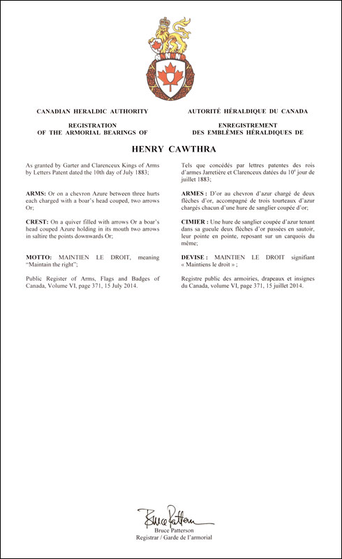 L'utilisation du contenu du Registre public est réservée à des fins de recherche uniquement. Les emblèmes héraldiques du Registre ne peuvent être reproduits sous aucune forme ou par quelque procédé que ce soit sans l'autorisation écrite de l'Autorité héraldique du Canada et/ou du récipiendaire.