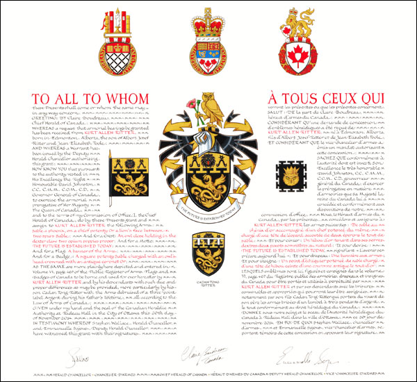 Armoiries de Kurt Allen RitterBlasonDe sable au phénix d’or accompagné d’un chef potencé du même chargé d’une tête de léopard accostée de deux éperons le tout de sable; SymbolismeLe noir et le jaune sont les couleurs du duché de Wurtemberg, en Allemagne, d’où est originaire la famille du Dr Ritter. Le phénix représente l’héritage chinois de l’épouse du Dr Ritter. Rappelant les lions des armes du Wurtemberg, la tête de lion est un symbole de vigilance, une valeur qui est au cœur de la profession de médecin du Dr Ritter. Les éperons, traditionnellement remis durant l’adoubement d’un chevalier (Ritter en allemand), renvoient au patronyme familial. La ligne en forme de T évoque la béquille, qui favorise la guérison, et symbolise la force; elle rappelle la carrière médicale du Dr Ritter, notamment son travail dans le domaine de la gestion de la douleur chez les patients atteints du cancer. |