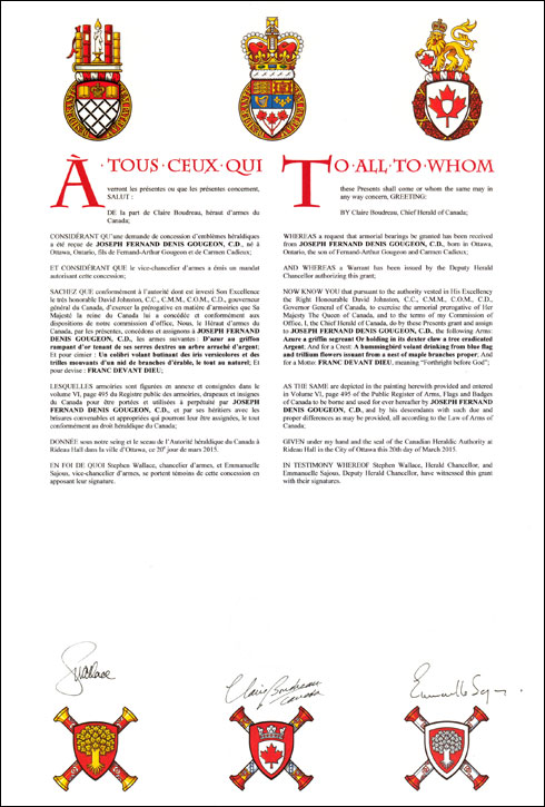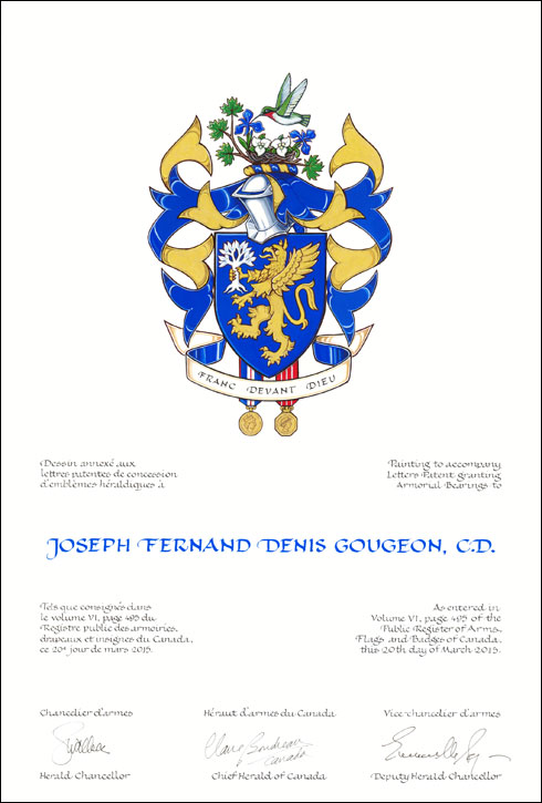 Armoiries de Joseph Fernand Denis GougeonBlasonD’azur au griffon rampant d’or tenant de ses serres dextres un arbre arraché d’argent; SymbolismeLe griffon est un animal mythique fier et tenace. À la fois aigle et lion, il représente le service militaire de M. Gougeon à titre d’instructeur et de commandant des cadets de l’air et de l’armée, tandis que la couleur bleue représente son service militaire avec les cadets de la marine. La tête d’aigle du griffon évoque également le lac de l’Aigle, au Québec, où il possède un chalet et dont il fut président et membre fondateur de l’Association des propriétaires. L’arbre symbolise un arbre généalogique, évoquant ainsi sa famille et son intérêt de longue date pour la généalogie. |