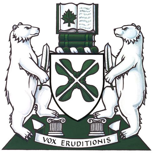 SupportsBlasonDeux ours polaires d’argent chacun tenant une plume du même, le tuyau de sinople, leur patte postérieure reposant sur un chapiteau ionique d’argent, debout sur un quadrangle de sinople; SymbolismeLes ours polaires sont les cousins canadiens d’un animal qui a longtemps été utilisé en héraldique et que l’on retrouve dans la mythologie de plusieurs cultures. Dans diverses régions du monde, l’ours symbolise la force, la bravoure, la sagesse et la protection des jeunes. Il a également été souvent associé à certains rites de passage et à l’idée de vie nouvelle. D’après les bestiaires médiévaux, un ours adulte peut physiquement façonner son petit, une idée qui peut servir de métaphore pour l’éducation. La plume que tient l’ours représente non seulement les responsabilités de l’organisation en matière de recherche et d’échange d’information, mais peut également évoquer l’utilisation de la plume d’aigle par les Premières Nations comme symbole d’autorité et de dialogue au sein d’une assemblée. Par extension, cela peut s’appliquer à l’idée que l’organisation est un « lieu de rencontre » pour les établissements qui en sont membres, où celles-ci partagent leurs préoccupations et leur savoir. Les colonnes ioniques représentent les origines classiques de l’enseignement universitaire. La terrasse prend la forme d’un carré pour indiquer le quadrilatère caractéristique de plusieurs campus universitaires au Canada. |