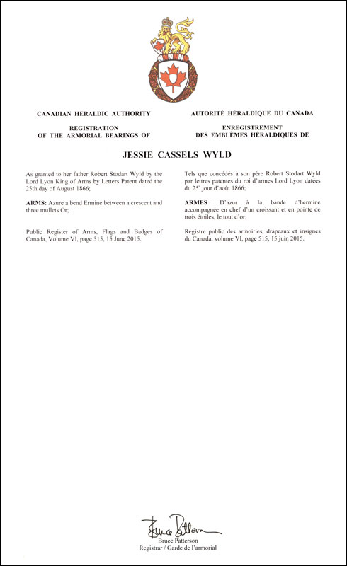 L'utilisation du contenu du Registre public est réservée à des fins de recherche uniquement. Les emblèmes héraldiques du Registre ne peuvent être reproduits sous aucune forme ou par quelque procédé que ce soit sans l'autorisation écrite de l'Autorité héraldique du Canada et/ou du récipiendaire.